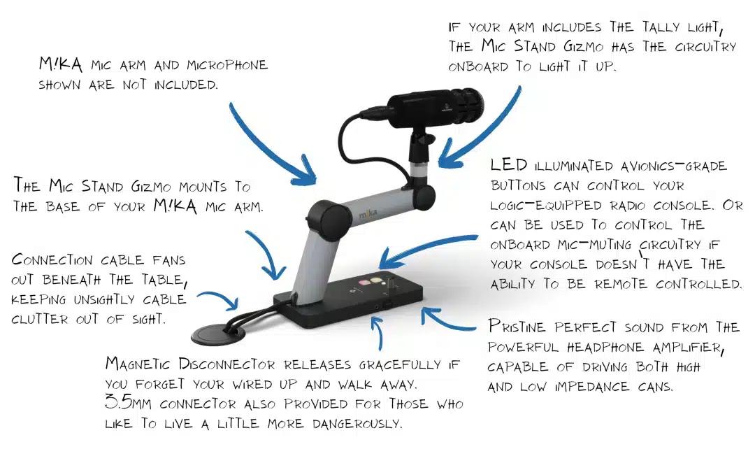 The tally light (the little LED in your M!KA arm) gets powered through the Gizmo too. This means you can signal mic status (like “on-air” or “off-air”) visually, so guests and hosts know what’s hot.