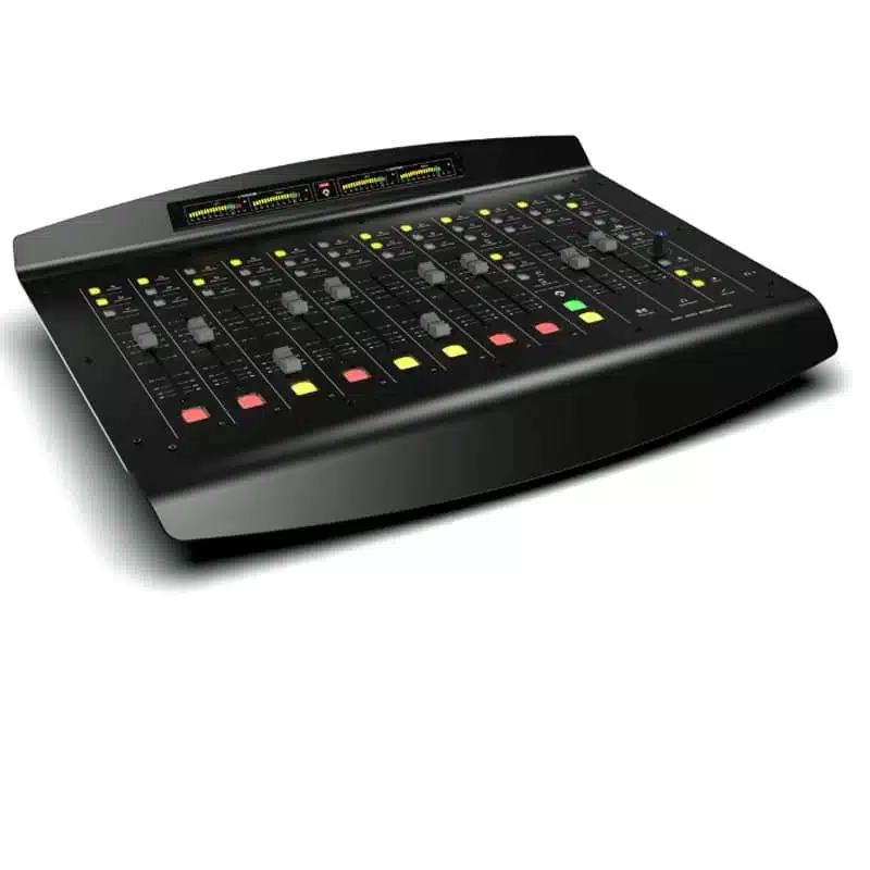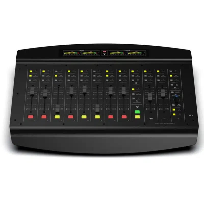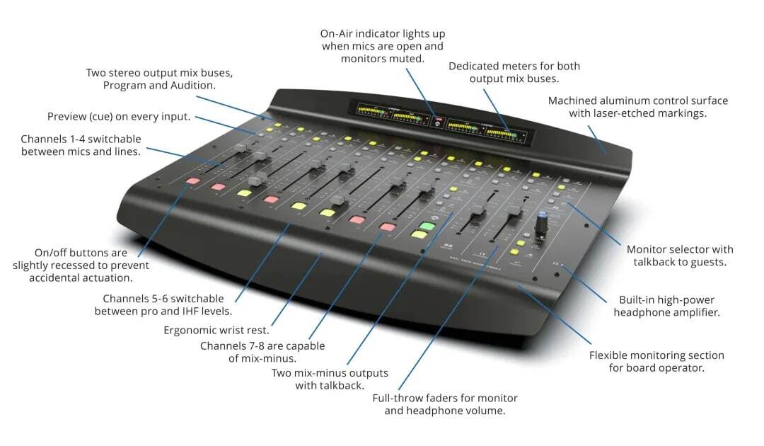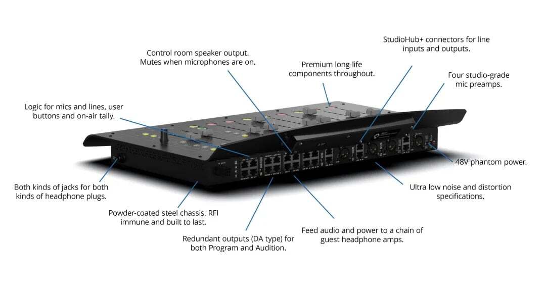Installation is simplified with StudioHub+ RJ45 connectors for line inputs and outputs, XLR inputs for microphones, a built-in power supply (eliminating the need for a wall wart), mic and line remote logic, and warning and user tally outputs for lighting ON AIR signs and annunciators. Each channel includes a preview (cue) function. The faders are designed to operate smoothly, and avionics-style switches with LED illumination are used. The mixer features a sleek, low-profile desktop design.