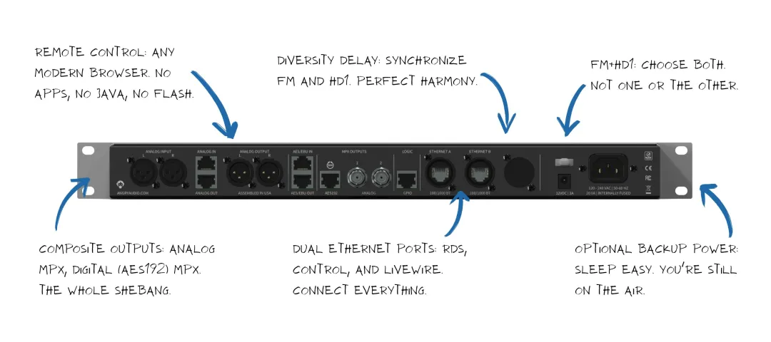 - RDS/RDS2 Built-In Encoders: Support for full RDS encoding (with remote control via UECP/ASCII) and RDS2 features (logos and extended PS texts using UTF-8).