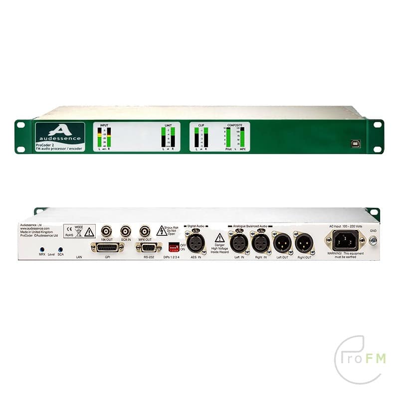Audessence introduces ProCoder-2, a fully-featured final FM processor / stereo encoder combination. Older FM sites can have their sound upgraded easily and at modest cost. Many transmitters and audio links suffer from overshoots that make it impossible to optimise loudness and audio quality! This product includes low frequency compensator and advanced HF overshoot inhibiting algorithms for getting the best modulation yield (and therefore coverage) out of all FM transmission sites.
