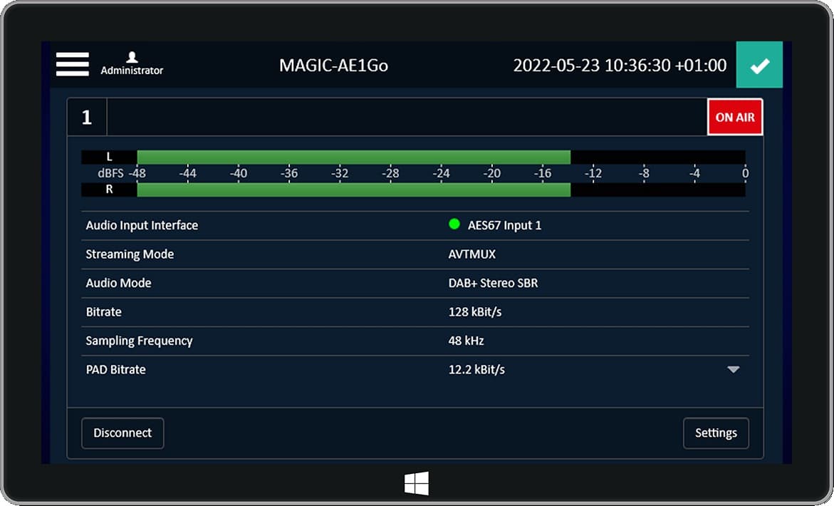 The high quality and professional DSP-based hardware audio encoder MAGIC AE1 DAB+ Go is realized as a fanless ½ x 19‘‘ device. Both analogue and digital audio interfaces are available for the input of the audio signal. The supplied Windows software allows the configuration of up to 40 systems.