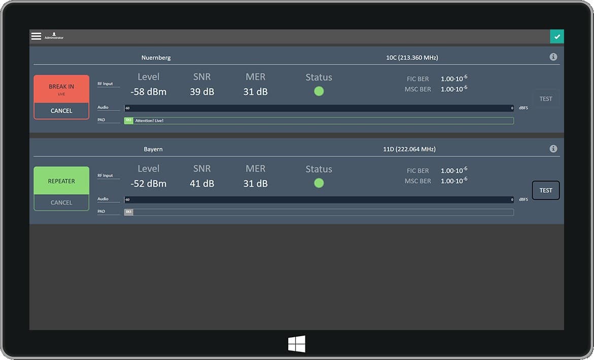 The complete Ensemble can be monitored via a Monitoring Decoder.In the standard operation mode the system functions a classic repeater. The DAB Ensemble is received by an antenna outside the tunnel, is filtered digitally and processed. Via the tunnel antenna the signal is broadcasted again.