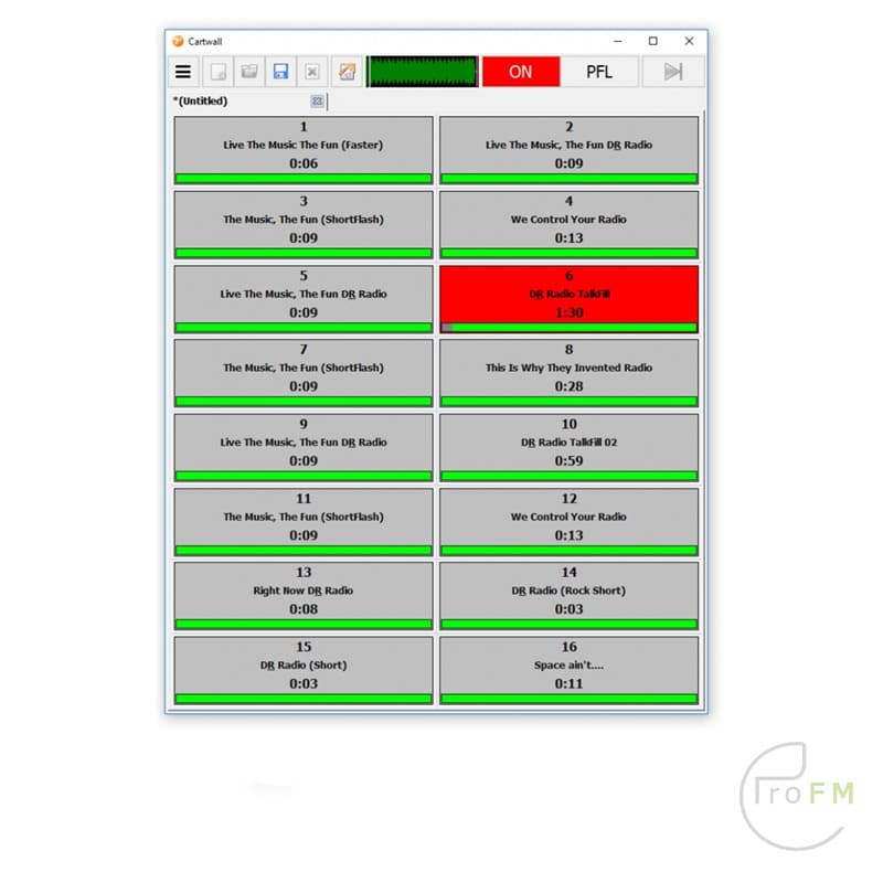 The Cartwall can be used to play short jingles or other audio elements. The number of players/slots is technically unlimited. Cart sets/pages can be saved as favorites for quick access.
