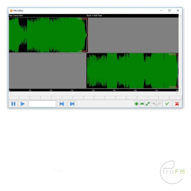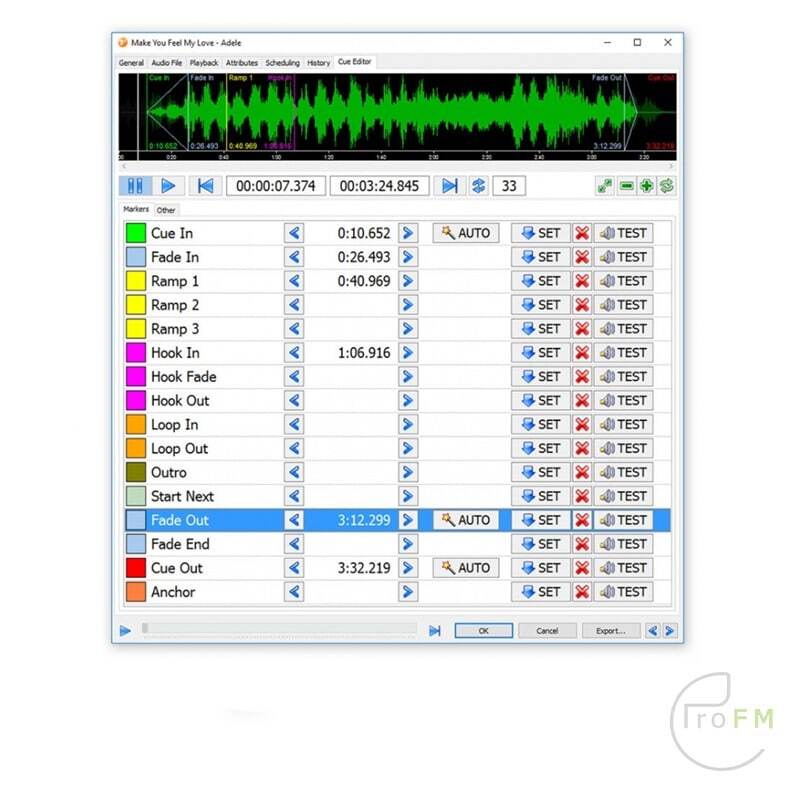 The graphical Cue Editor allows you to edit the cue markers (ramp, fade out, etc.) of any item quickly based on a waveform image of the audio. Cue markers can be saved to file tags (selected file formats only) or metadata XML files for later use.