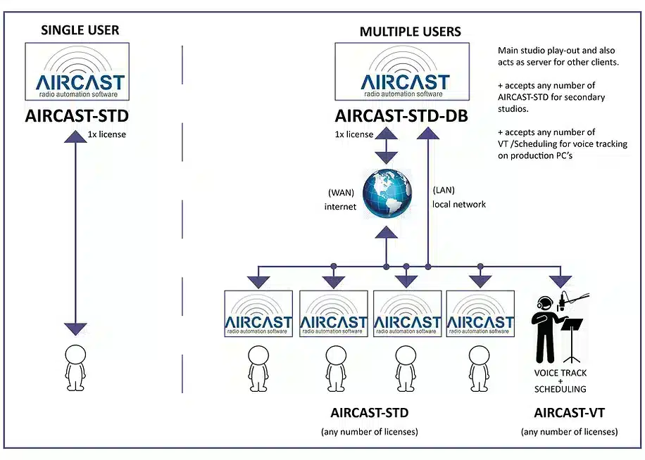 – Also the VT-licenses will work with this DB-version.AIRCAST-VT Package: – User can remotely do VoiceTracking and log-on to
