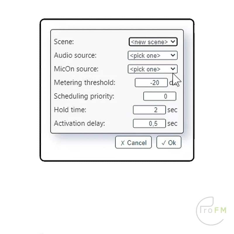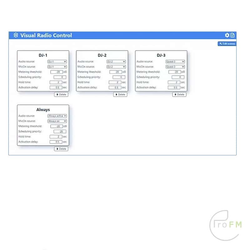 The Visual Radio Control (VRC software) connects the scenes from the Broadcasting Software to channels on the Camcon Visual Radio device. With metering and the MicOn information that the Camcon provides to the Visual Radio Control (VRC) software it is possible to make decisions which scene needs to be active at a given moment. Settings like Priority, Hold time and Activation delay can be set to suit your needs.
