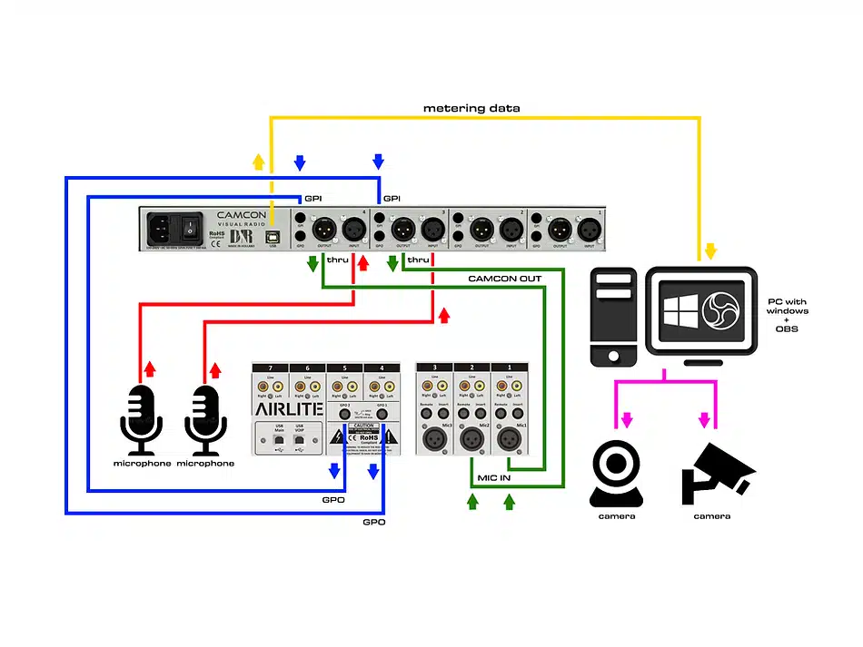 The D&R Camcon Visual Radio Triggerbox needs to be used with the Camcon Control (CCS) Software and Visual Radio Control (VRC) software. Both software packages can be downloaded form our website when installing the CamCom hardware. This VRC software will process the Camcon data to control the camera’s connected to OBS (free open source software) The final signal flow will be: MIC > CAMCON > VRC > OBS. The Camcon can add 4 Camera’s to any mixing console.