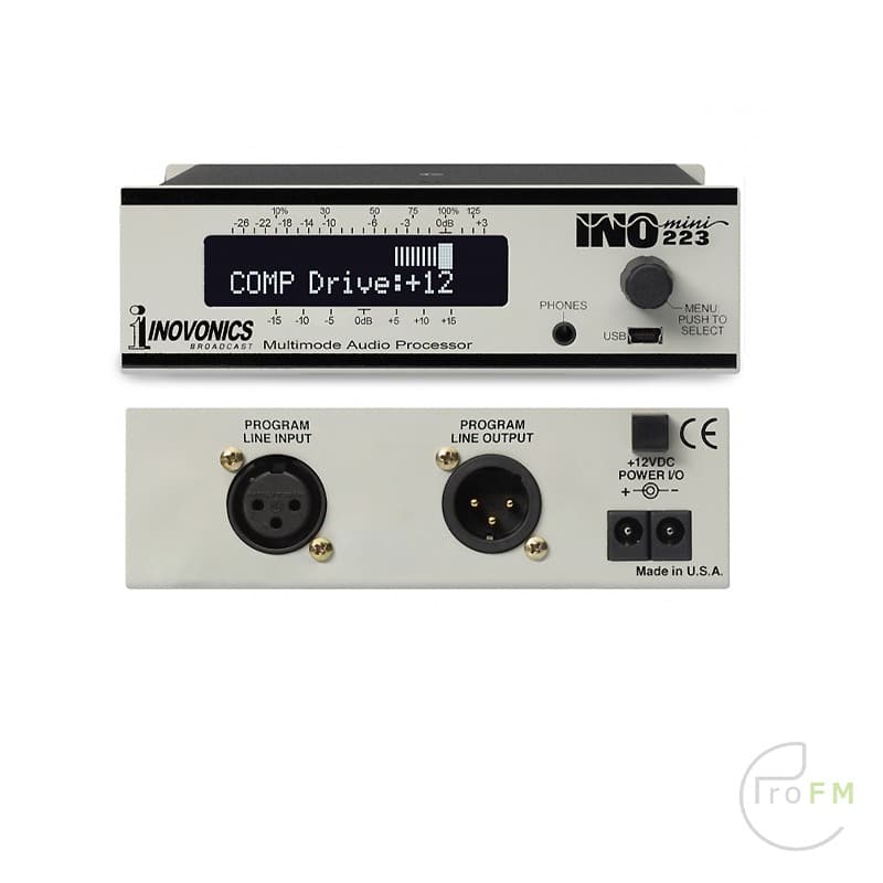 Inovonics’ INOmini 223 is an audio processing powerhouse in a deceptively small package. Its versatile DSP-based design is userprogrammable to serve multiple broadcast applications without compromising any single one. The unit addresses the needs of NRSC-compliant AM broadcasting with a range of cutoff frequencies, TIS (Traveler’s Information Service) advisories, monaural LPFM transmission, and analog SCA subcarriers.