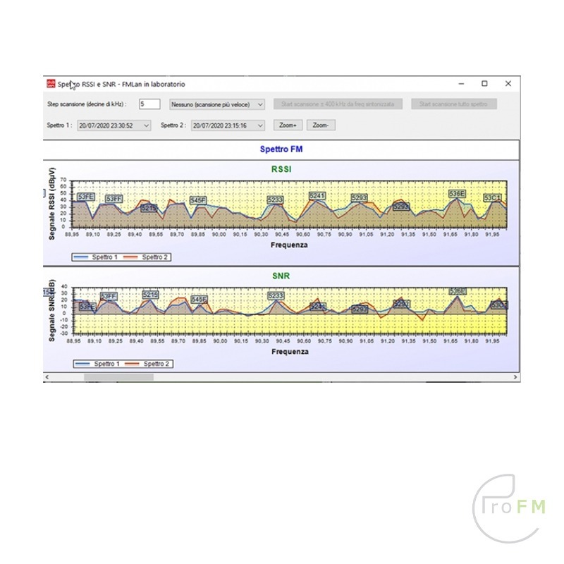 From the connection dashboard it is possible to enter the “Spectrum” page, which allows you to perform scans with settable steps, on the whole FM spectrum or + -400 khz from the tuned frequency. For each frequency tuned during the scan, the RSSI and SNR parameters will be acquired, and optionally, also the PI parameter of the RDS. Each scan will be saved in the database with date and time, it will be possible to recall it in the future and overlap it with any other scan in order to make comparisons over time.
