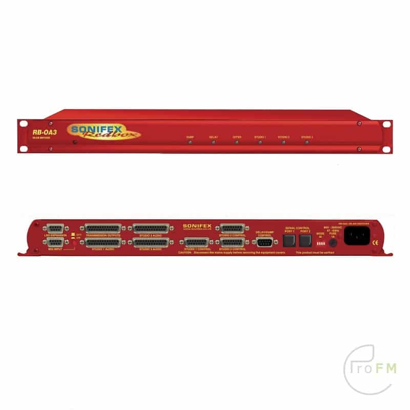 The RB-OA3 is a 1U rack-mount, unity gain on-air switcher, capable of switching three stereo pairs between three studios. Each studio can control the transmission path together with two peripheral paths for equipment such as a codec or hybrid and there is also a “Last studio to offer” bus, allowing for seamless and continuous broadcast from any multi-studio radio network. A “sustain” mode allows for a sustaining system, such as a PC automation system, to control the broadcast. Multiple RB-OA3 units can be connected together to switch more studios or more stereo pairs.