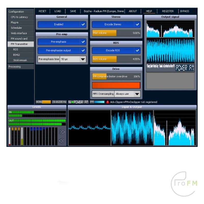 Special support (not free) is included for radio stations: Much louder output levels, FM pre-emphasis, stereo coding and RDS coding for FM stations, and protection of highs against distortion caused by lossy compression for web radio stations. The processing latency can be reduced as low as12 ms, at the cost of reduced fidelity. At the maximum quality the processing latency is 93 ms.